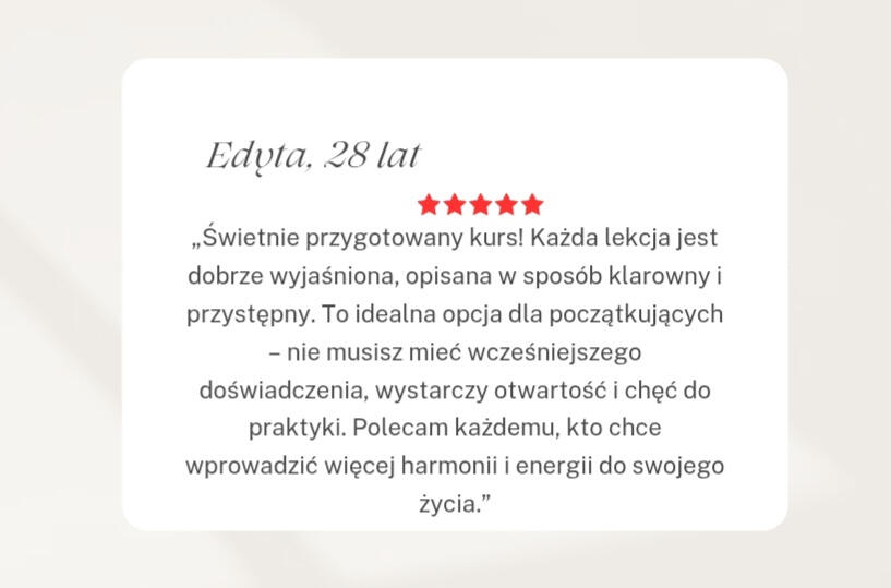 Poznaj Agnieszkę – Twojego przewodnika w kursie Sztuka KundaliniKiedyś czułam, że czegoś mi brakuje…Żyłam w ciągłym biegu, zmęczona, przytłoczona codziennością. Czułam, że gdzieś głęboko we mnie jest coś więcej – energia, potencjał, którego nie potrafiłam dotknąć. Próbowałam różnych metod, ale to właśnie Kundalini całkowicie odmieniło moje życie.Gdy po raz pierwszy poczułam przepływ tej energii, wszystko się zmieniło. Nagle świat stał się jaśniejszy, lęki zaczęły znikać, a ja w końcu poczułam się w pełni sobą.Wiem, jak to jest szukać… I wiem, jak to jest znaleźć. Dlatego stworzyłam ten kurs – dla Ciebie. Jeśli czujesz, że w Twoim wnętrzu drzemie coś więcej, jeśli chcesz odzyskać harmonię, radość i wewnętrzną siłę – zapraszam Cię do wspólnej podróży.Kundalini czeka. A ja pomogę Ci ją obudzić!